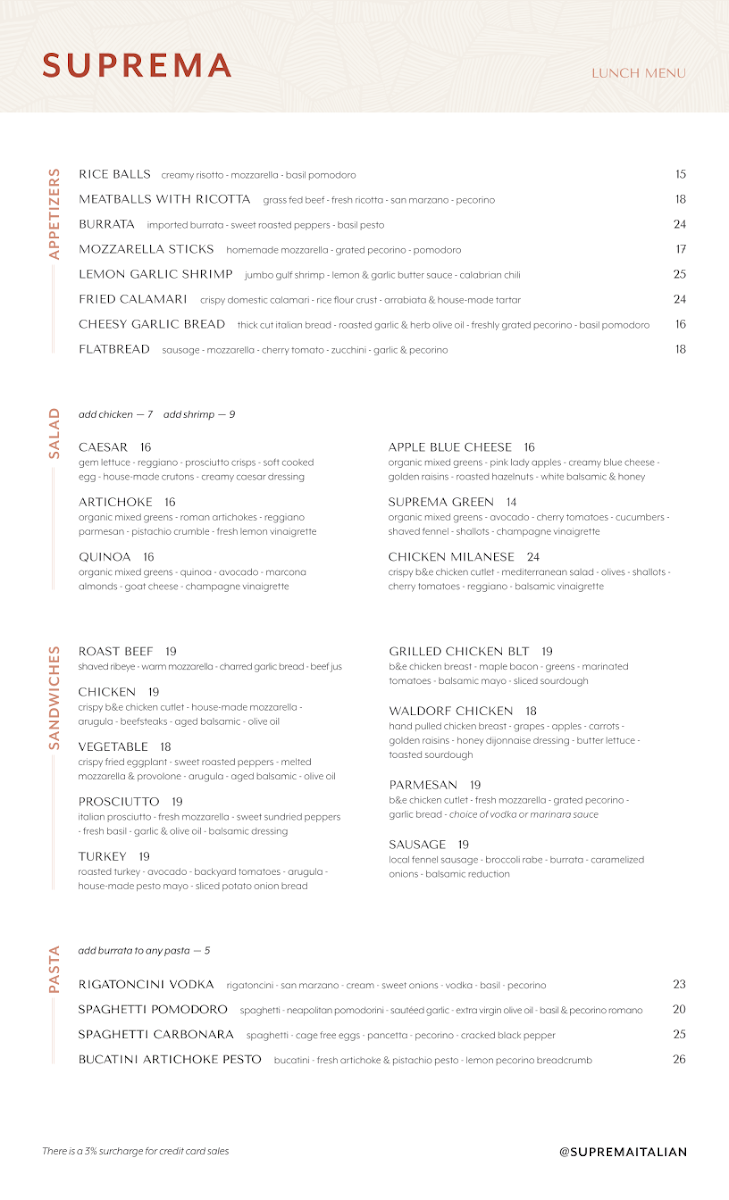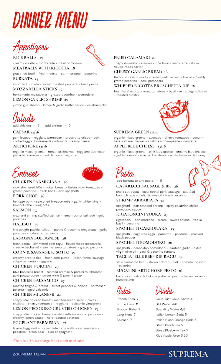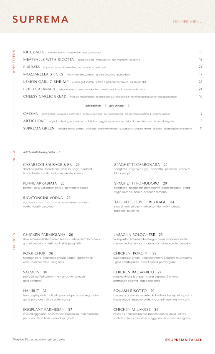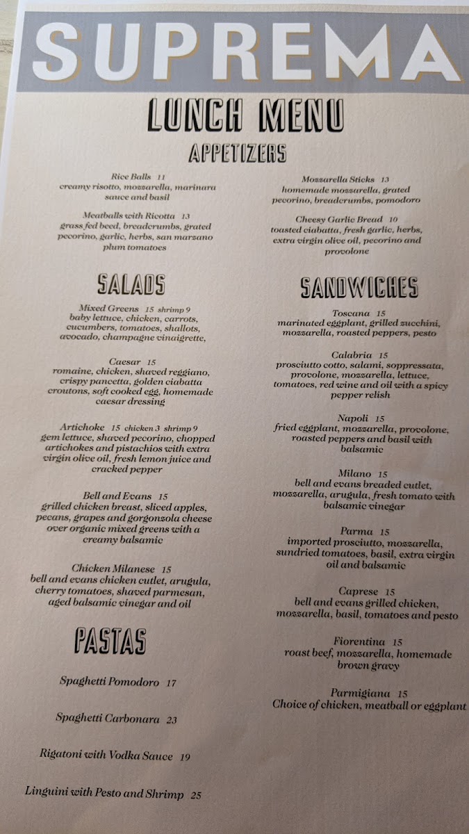 Whether you're savoring a plate of pasta al dente or indulging in mouthwatering desserts, Suprema promises a culinary experience that embraces tradition and quality. Don’t miss out on this authentic BYOB haven!